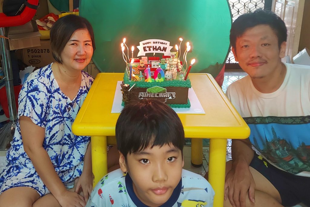 After the present time, come the family photo time. Of course, with the Minecraft-themed cake. There is iron golem on the cake, next to TNT. Don’t blow it please.